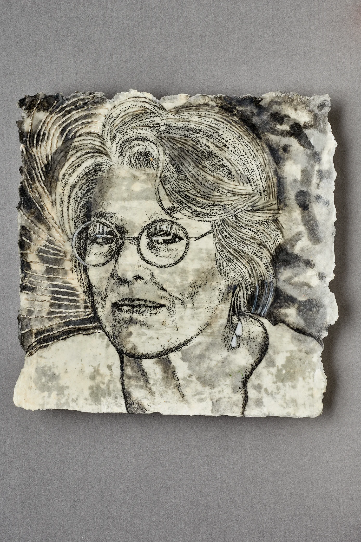 The Portraits are an evolving visual autobiography memorializing some of the important people in my life. They are created from handmade paper with pulp painting, beeswax, thread and original drawing photo transfers.